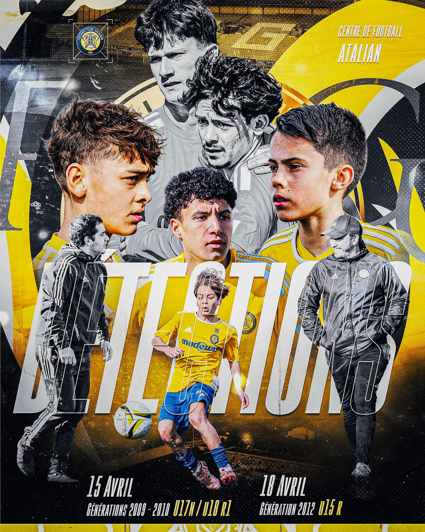 Le FC Gueugnon organise des détections le mercredi 15 avril 2026 à 13h30 au Centre de Football Atalian, avec des perspectives d’intégration de ses futures équipes en U17 Nationaux (2010) et U18 R1 (2009).